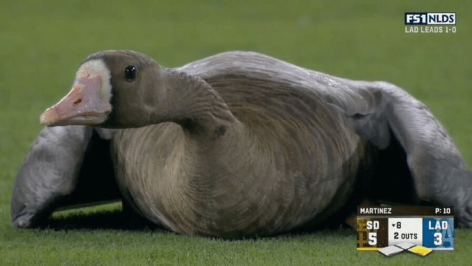 Must admit to being charmed that during #Postseason game of baseball, a sport known for its incredibly detailed & esoteric rules, there were folks out there educating us that the bird on Dodger stadium field was not just a goose, but a “greater white-fronted goose. “